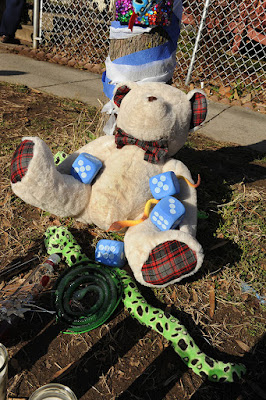 I spoke with his Mr. Jones' father (holding the button) and some neighbors at this large and visually vibrant memorial. His nickname was "Snakey," (which is why there were several toy snakes on the site) and according to a young observant Muslim woman who knew him and his family well, he was a positive person who didn't bother others, and will be missed.